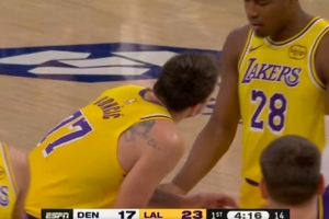 体育资讯3月15日讯 NBA常规赛,湖人对阵掘金。比赛中,东契奇保护篮板被八村打到要害。