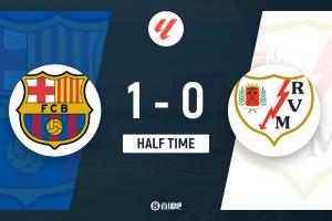 半场-巴萨1-0巴列卡诺 阿劳霍头球破门拉菲尼亚失单刀+远射中楣