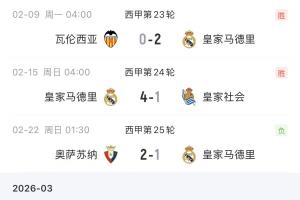 此前巴萨1-2不敌赫罗纳,皇马2分优势反超登顶。不过,皇马榜首仅体验了一轮,随后1-2奥萨苏纳、0-1赫塔费,从领先2分变成了落后4分。