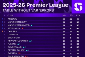 VAR没有错误情况下英超积分榜: